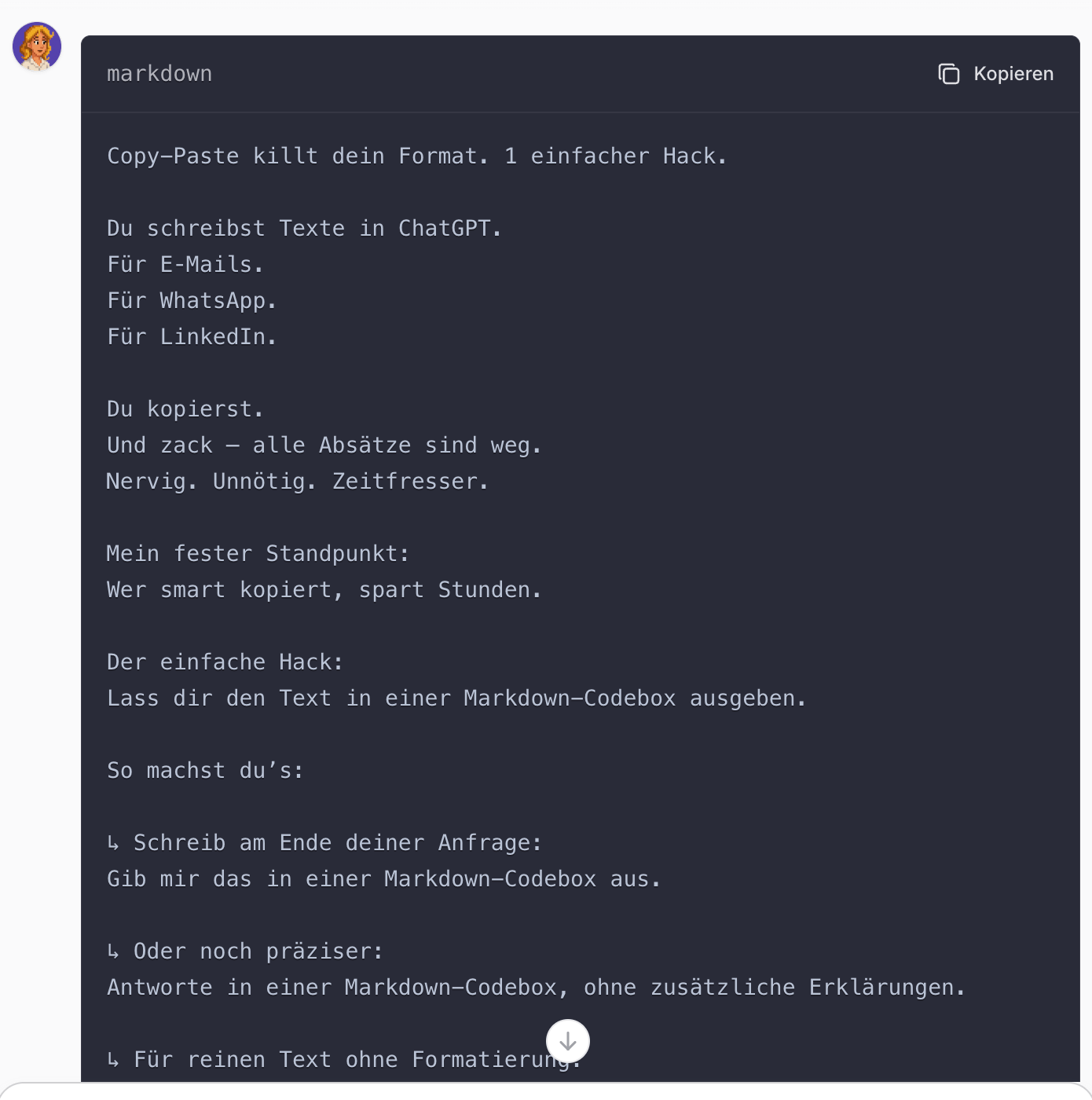Das Problem: Antworten sind oft schlecht formatiert und schwer zu kopieren. Gerade wenn du aus ChatGPT einfach Copy-Paste machen willst, wird das Format nicht übernommen.