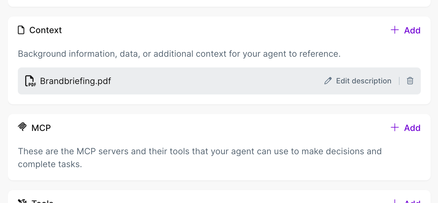 Du kannst ihm Dokumente mitgeben (PDFs, Word-Dateien, Brandbriefing), MCP-Server anbinden oder weitere Datenquellen hinzufügen.