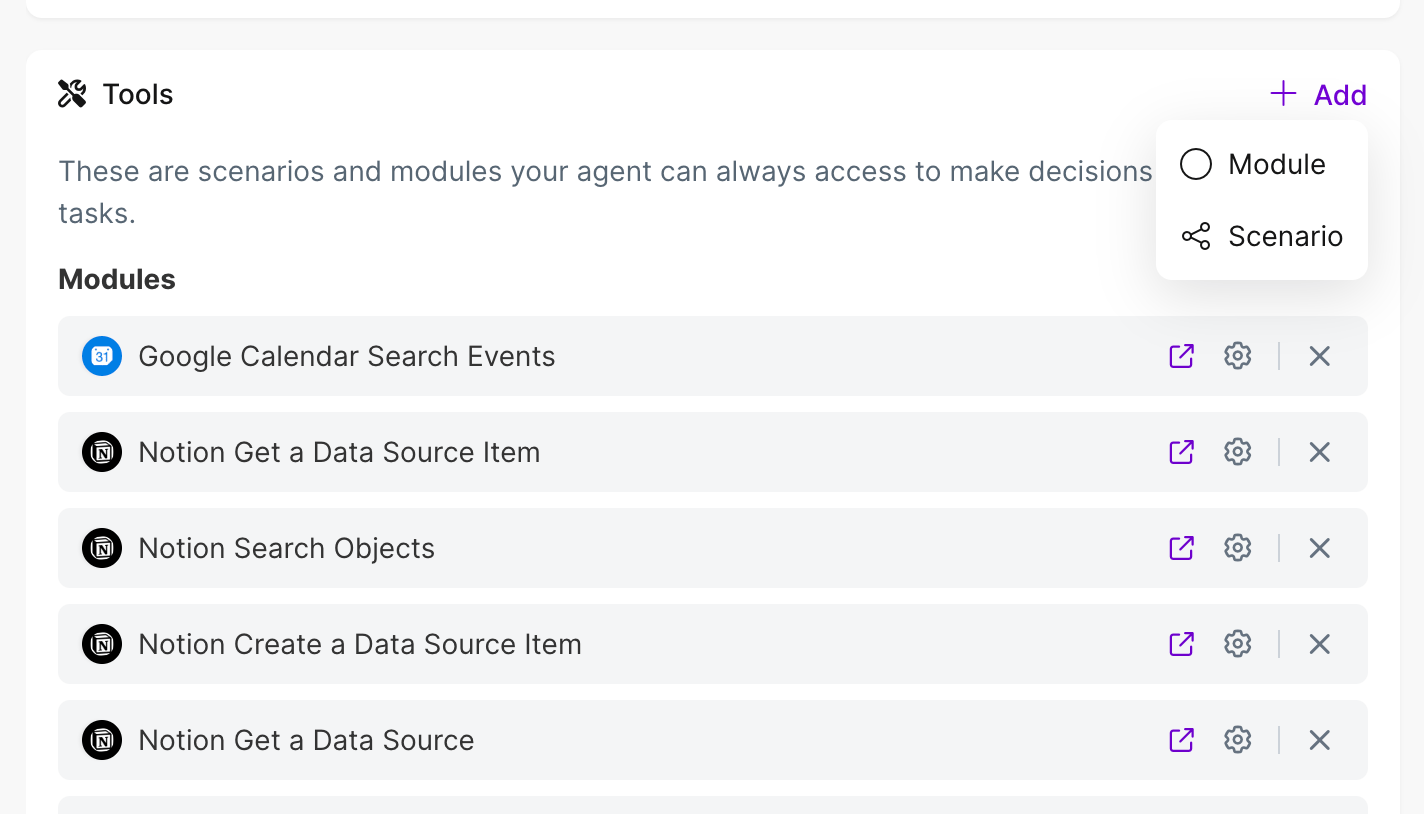 Ein Szenario ist ein kompletter Workflow in Make. Stell dir vor: Du hast einen Prozess gebaut, der automatisch LinkedIn-Posts erstellt (Recherche → Text schreiben → Bild generieren → Posten). Diesen ganzen Prozess kannst du deinem Agent als "Tool" mitgeben. Er nutzt ihn dann, wenn er ihn braucht.
