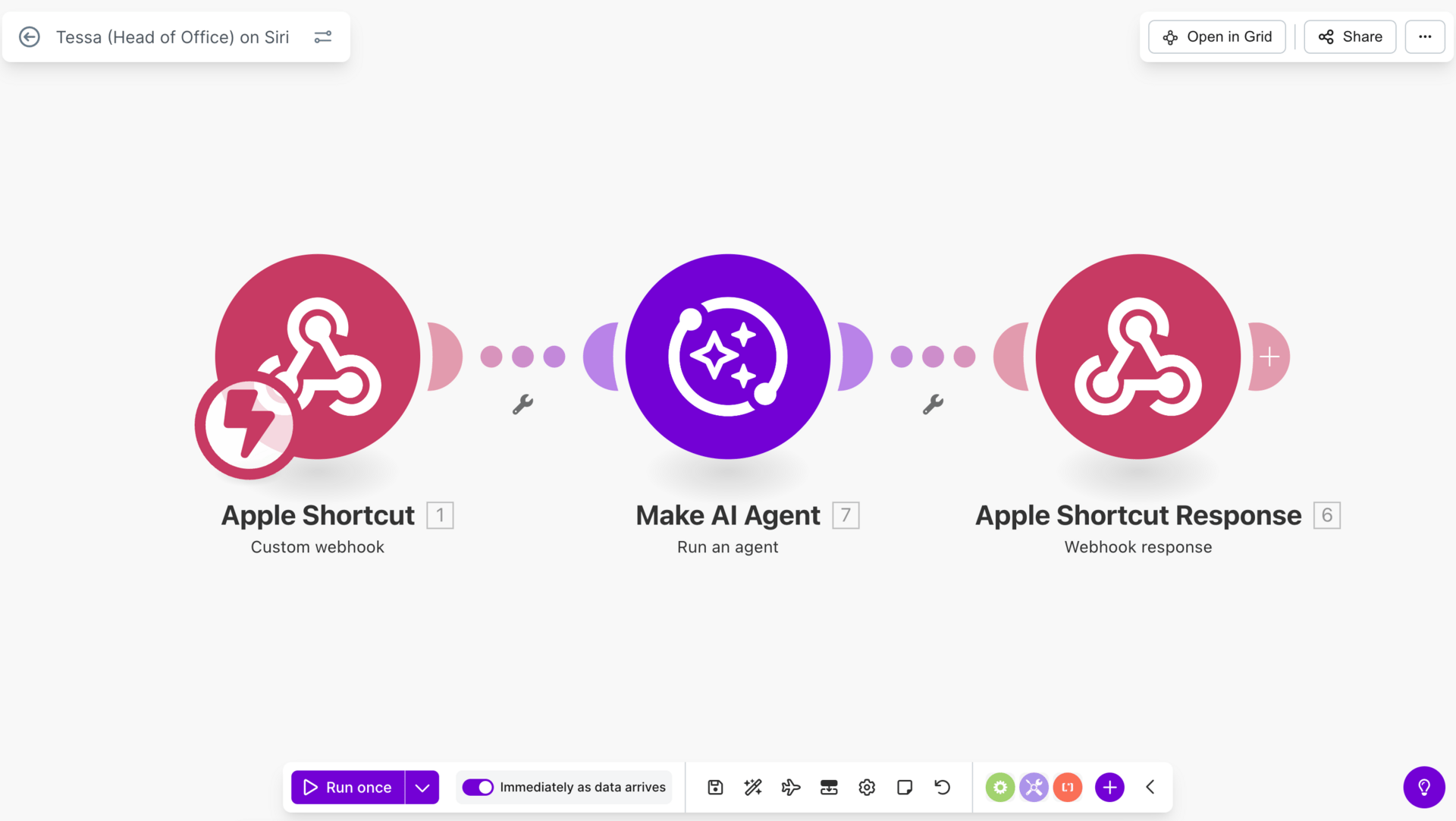 Siri triggert meinen Make Agent. Der Agent erstellt die To-Do in Notion und blockt Zeit in meinem Kalender.